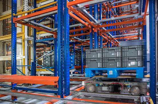 零部件立體庫,占地1880平米,總庫位1700個庫位,該庫位為WMS系統(倉庫管理系統)與MES系統(生產信息管理系統)及ERP系統(企業資源計劃管理系統)直接對接。系統會根據生產計劃自動出庫零部件,并通過RGV小車將零部件運送到指定工位。