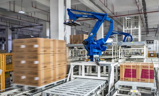 產品用機械手脫離流水線,效率提升80%以上。自動識別、包裝、封箱、打包、堆碼入庫,一直到產品出庫全部都是全自動。
