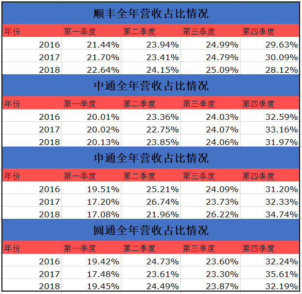 目前,雙十一已經成為“全民剁手”的重大節日,不僅是對品牌、平臺、支付的考驗,更是對快遞物流行業的考驗。數據顯示,2019年天貓雙十一的訂單總額達到了2684億元。通過順豐、圓通、申通、中通等快遞物流公司的營收情況可以發現,它們一年中幾乎均是第四季度的營收占比最高,這無疑與雙十一的影響高度相關。